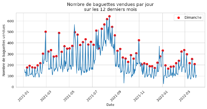 Pour se faire une idée, il trace l’évolution du nombre quotidien de baguettes vendues sur l’ensemble des 12 dernières semaines 1.